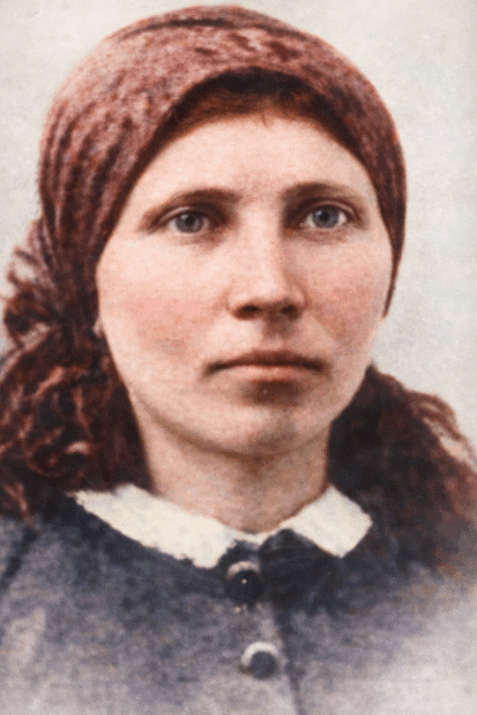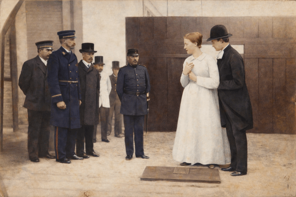 Änglamakerskan Anna Månsdotter strax före sin avrättning. Skarprättare Dalman står längst till vänster i bilden och håller bödelsyxan dold bakom ryggen.